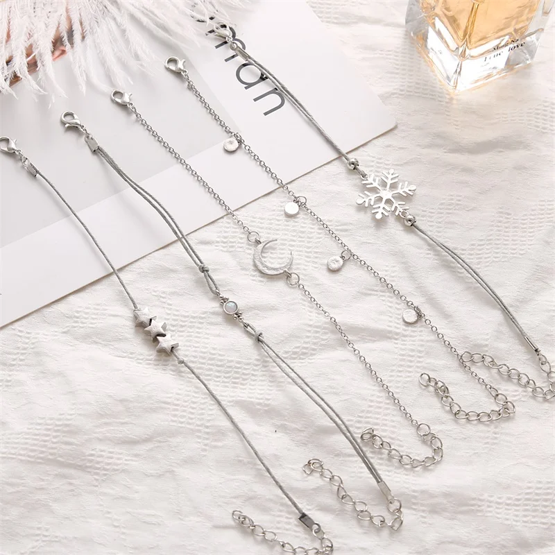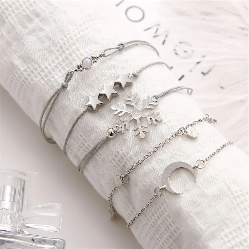 Promo KISS WIFE 5 Pcs/ Set Personality Snowflake Star Moon Round Pendant Silver Leather Chain Bracelet Se