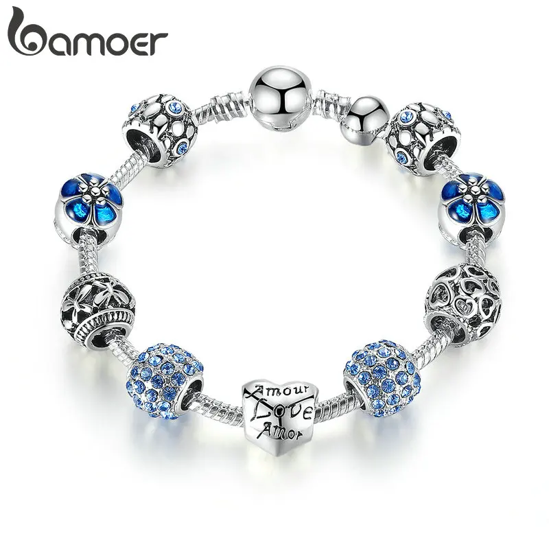 Buy BAMOER Antique Silver Charm Bracelet & Bangle with Love and Flower Beads Women Wedding Jewelry 4 Co