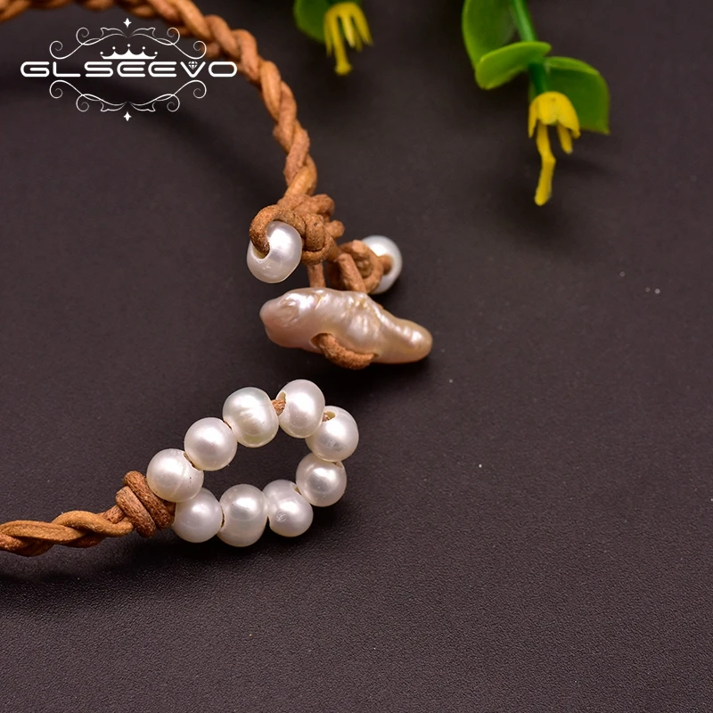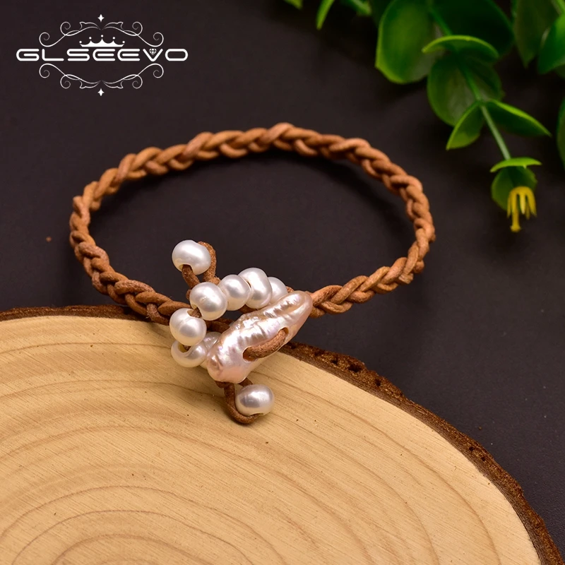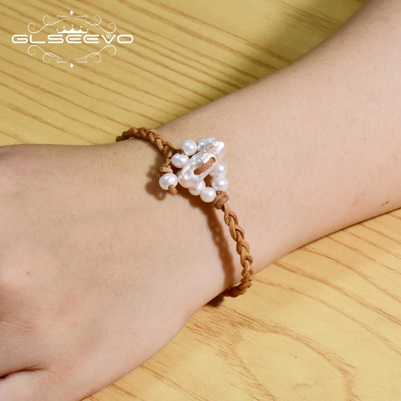 New GLSEEVO Natural Fresh Water Pearl White Leather Bracelet Luxury Jewellery For Women Girl Lovers' Gi