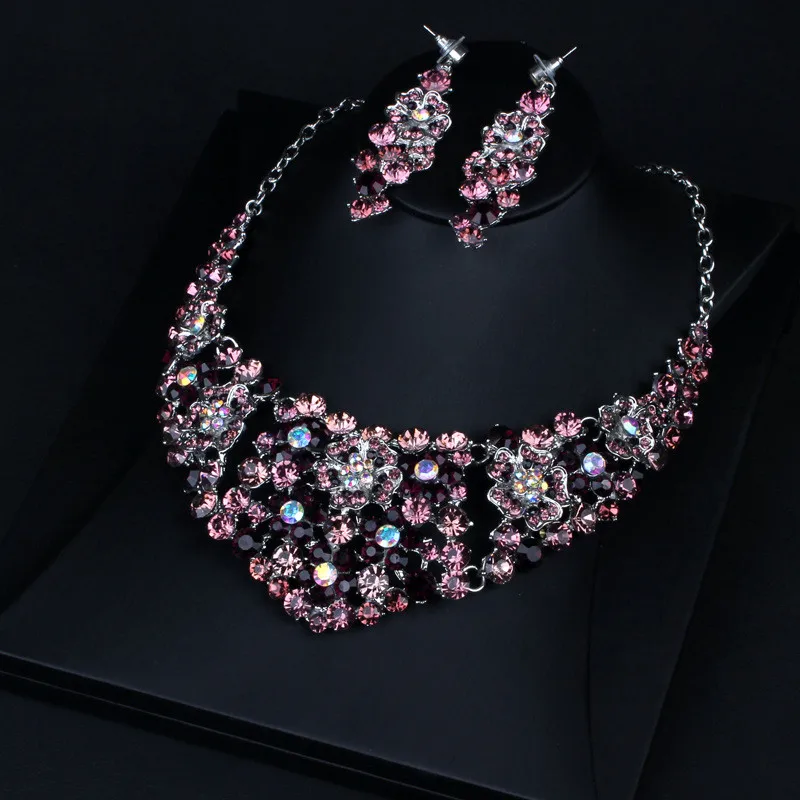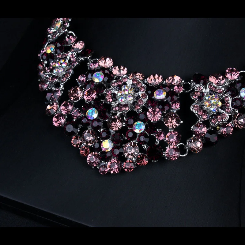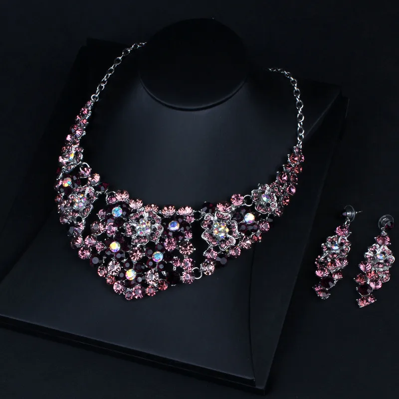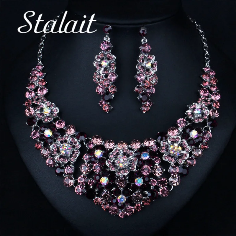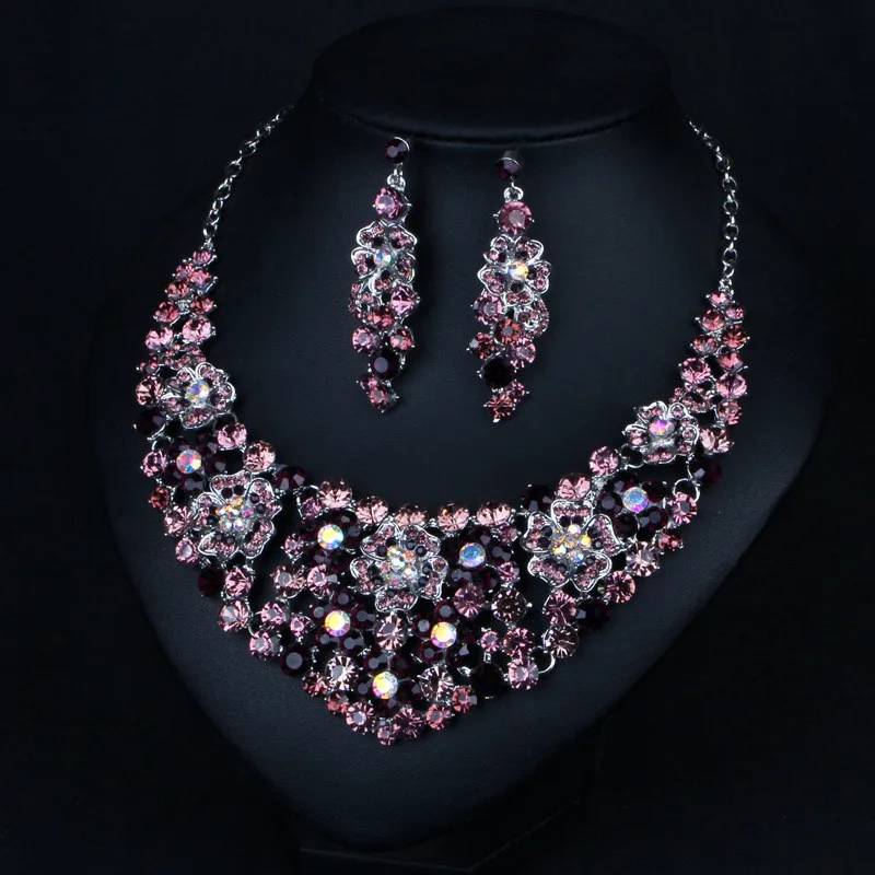 Promo Sumptuous Flower Bridal Wedding Prom Jewelry Purple Crystal Rhinestone Necklace & Earring Set For W